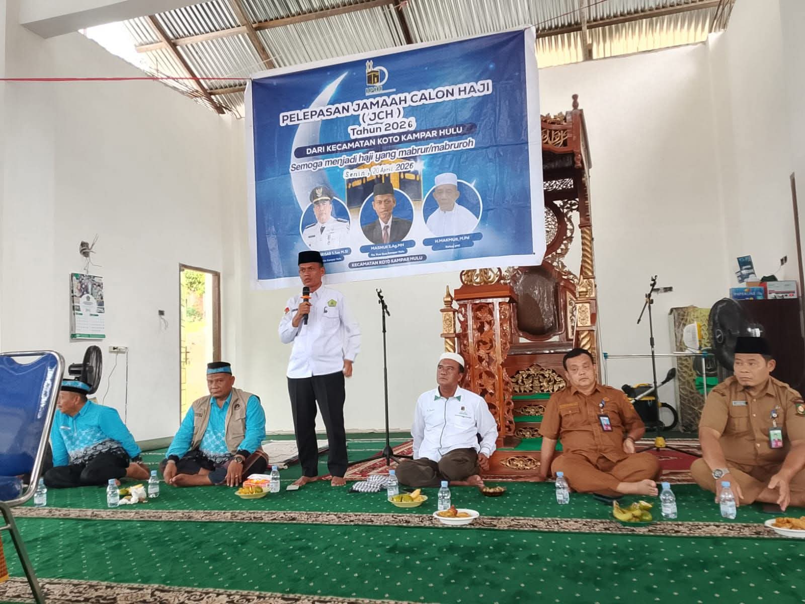 Pelitamedia.com – Suasana haru dan penuh doa menyelimuti halaman Masjid Baiturrahman, Desa Persiapan Tanjung Jaya, Kecamatan Koto Kampar Hulu, Senin (20/04/2026). Sebanyak 14 orang jamaah haji asal Kecamatan Koto Kampar Hulu dan Kecamatan XIII Koto Kampar dilepas secara resmi untuk menunaikan rukun Islam kelima ke Tanah Suci.